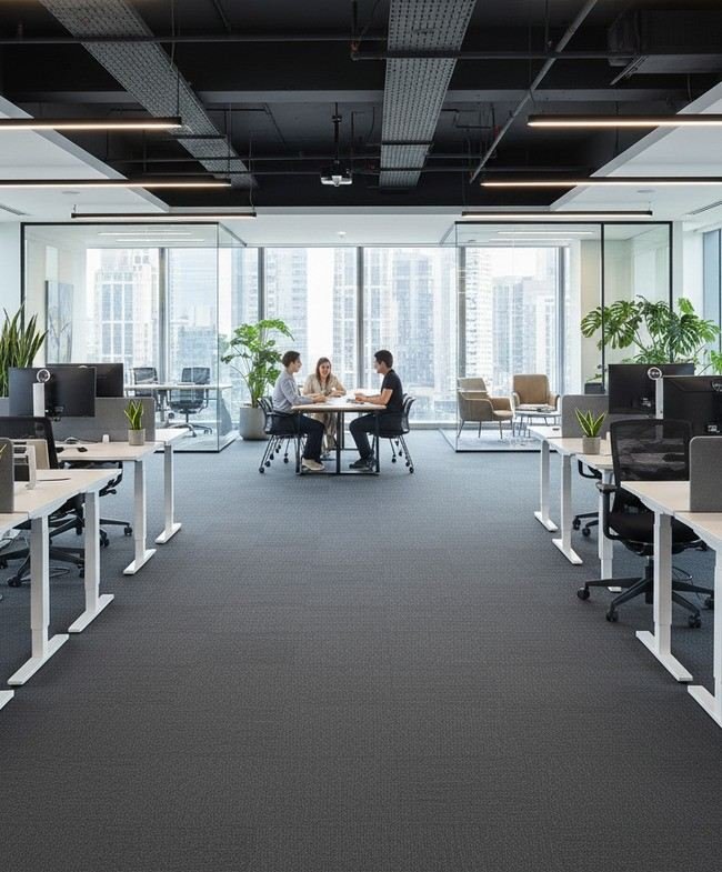 Carpet Tiles – Provide noise reduction, comfort, and flexibility for open-plan offices and conference rooms.